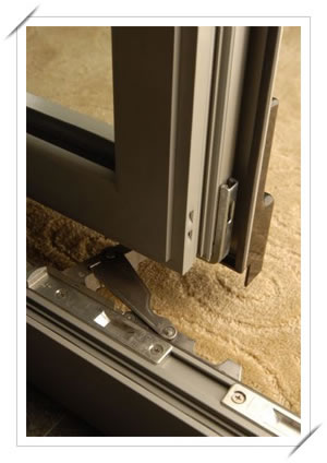 When in the closed position, a multi-point locking system pulls the operable sashes tight against a triple weather strip system, pulling it flat into the same plane as the adjoined fixed doors. When the handle on the first opening sash is turned, the patio door tilts inward at the top. Further rotation of the handle kicks the bottom of the patio door inward, allowing it to be pushed over the fixed doors next to it.